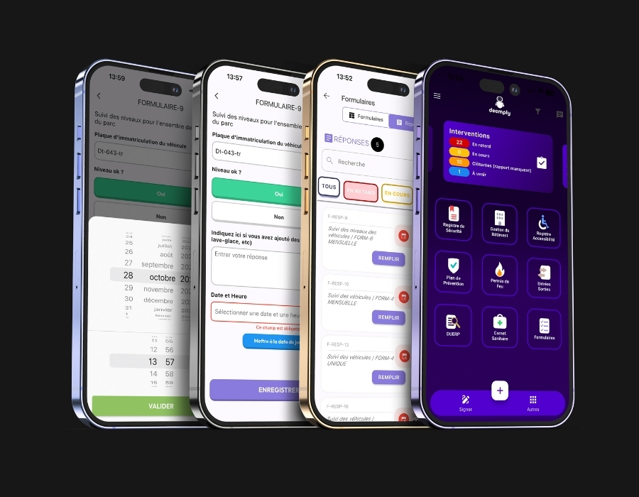 Depuis un smartphone ou une tablette, vous pourrez avec vos équipes remplir tous les formulaires que vous aurez créés. En téléchargeant l’application mobile Deemply, disponible sur tous les stores, vous allez accéder à tous vos documents et ainsi pouvoir les consulter, renseigner ou exporter.